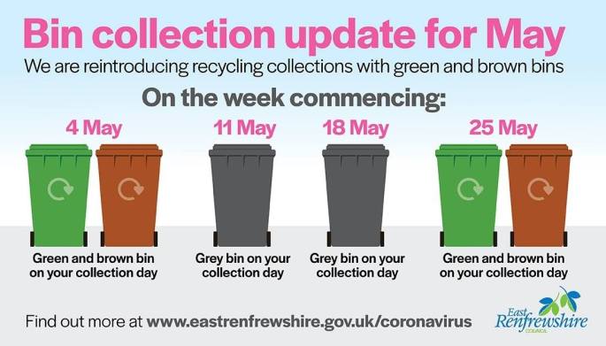 Bins update for May: recycling collections will be reintroduced for green and brown bins.